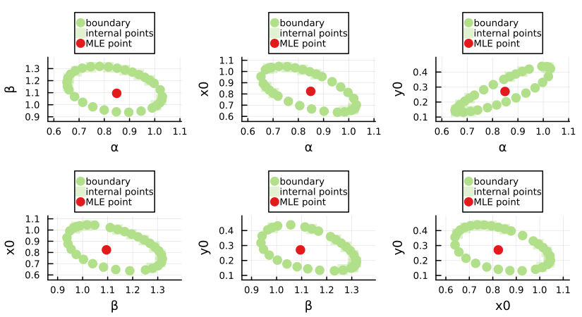 To evaluate the bivariate boundaries for all six bivariate parameter combinations, here we use the IterativeBoundaryMethod, which uses a 10 point ellipse approximation of the boundary as a starting guess using RadialMLEMethod. The boundaries in this example are reasonably convex, which makes this starting guess appropriate. To speed up computation we provide stronger optimization settings.