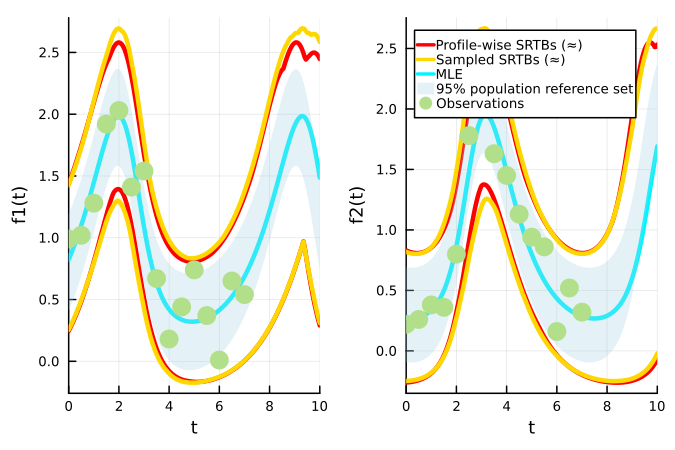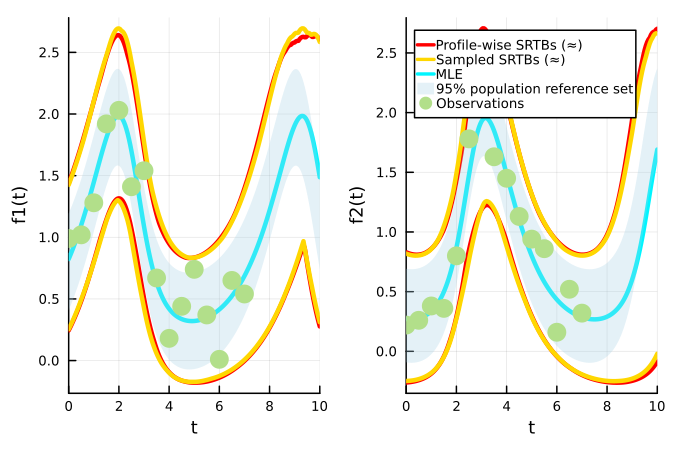 add_error_function!(model, errorfunction)To generate profile-wise predictions for each of the evaluated profiles we first define the desired time points for prediction and then evaluate the approximate model trajectory confidence sets and $(1-\delta, 1-\alpha)$ population reference tolerance sets. By default, the population reference tolerance set evaluates reference interval regions at the same level as the default confidence level ($1-\delta = 1-\alpha = 0.95$); however, this is not required. We are making predictions outside the range of the data used to evaluate the profiles.