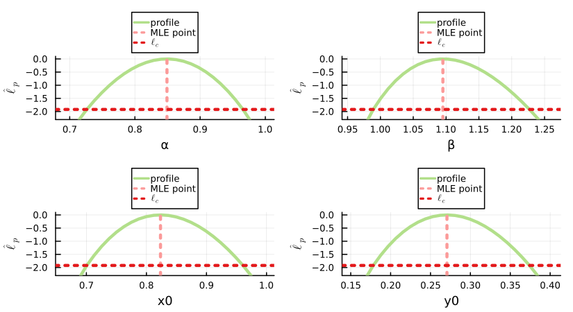 optimizationsettings=opt_settings)Similarly, if we wish to evaluate simultaneous 95% bivariate profiles we set the degrees of freedom parameter, dof, to the number of model parameters (instead of 2).